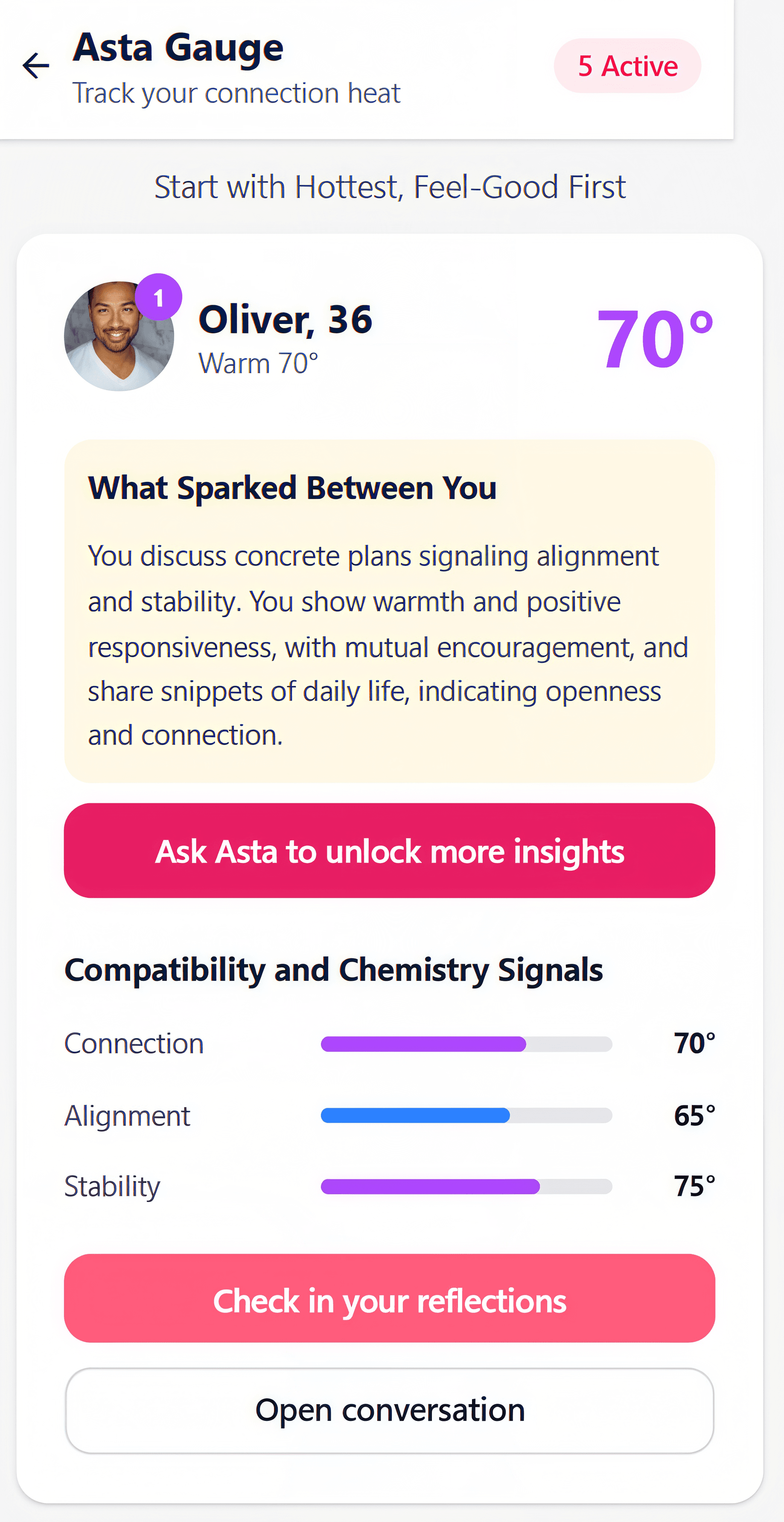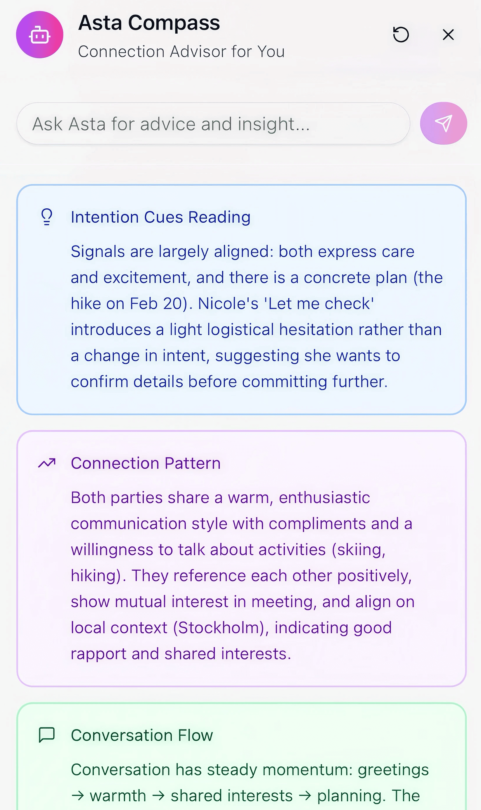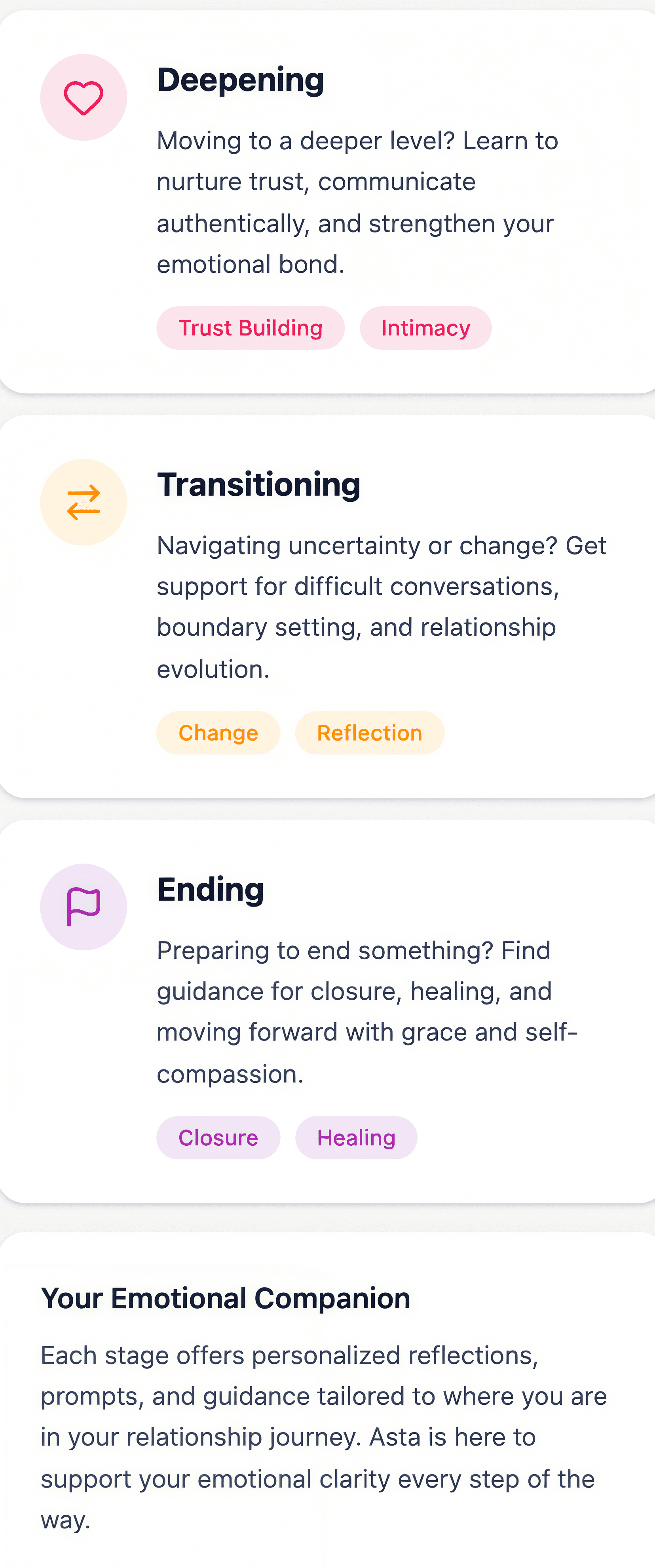 Whether you’re meeting someone new, deepening a relationship, rebuilding trust, or deciding to let go, Asta helps you understand your emotions, communicate with clarity, and move forward with intention.